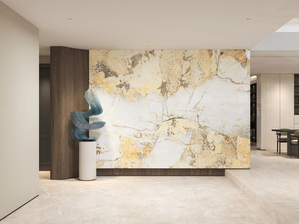 Việc sử dụng khổ lớn kết hợp ánh sáng hắt tường sẽ làm nổi bật từng đường vân đá, tạo hiệu ứng thị giác mạnh mẽ.