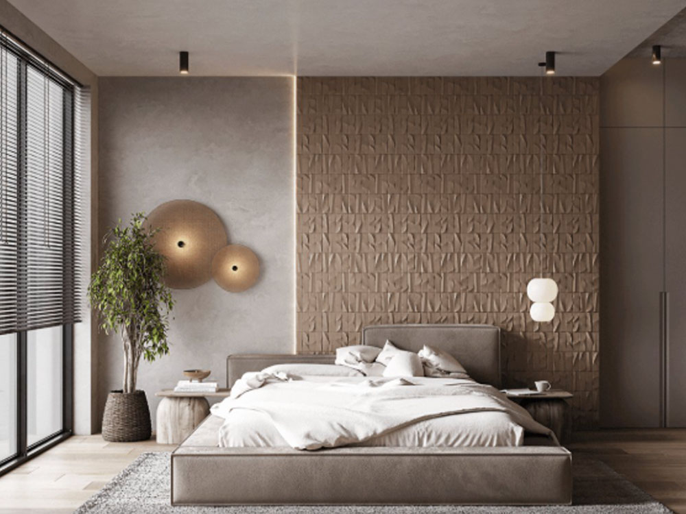 Trong phòng ngủ master, gạch 3D thường được ứng dụng tại mảng tường đầu giường. Bề mặt gợn sóng nhẹ giúp: