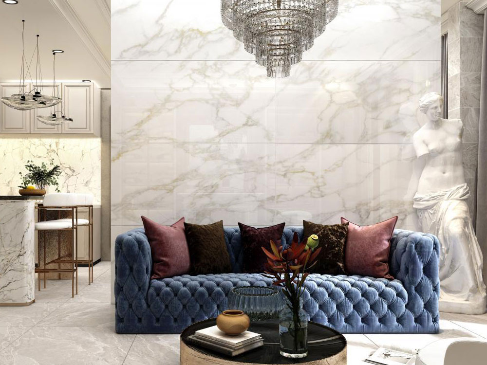Phòng khách là khu vực thể hiện rõ nhất gu thẩm mỹ của gia chủ. Khi sử dụng gạch vân đá marble trắng, limestone hay vân khoáng để ốp mảng tường lớn hoặc tường TV không gian sẽ: